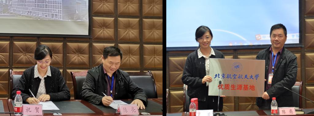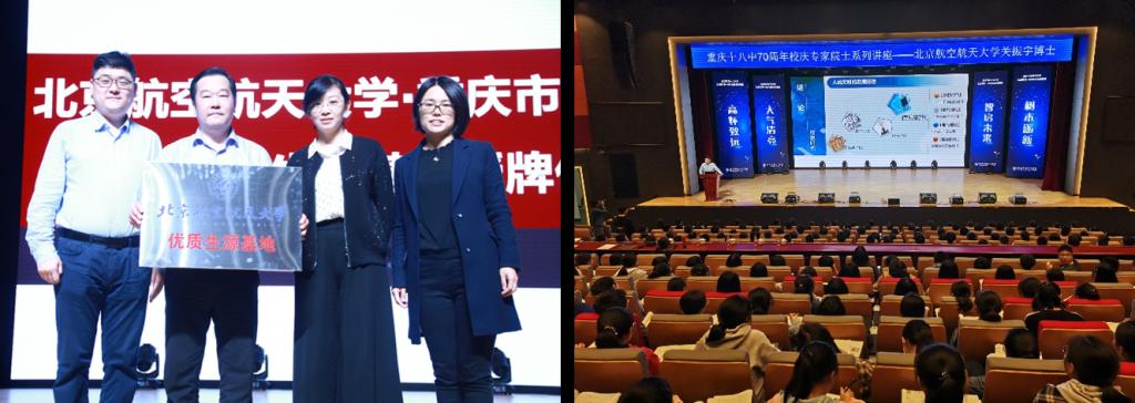 2019年4月15-16日,北航重庆招生组赴渝开展招生宣传活动。滚球买球的app官网党委副书记祝贺、滚球买球的app官网重庆招生组副组长李圆圆、滚球买球的app官网关振宇一行走进重庆市第十八中学校和铜梁中学,签署合作协议,建立“滚球买球的app官网优质生源基地”,并组织“教授进中学”系列报告等招生宣传活动。