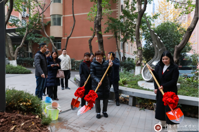 在重庆八中的访问过程中,苏东林院士一行与重庆八中付英副校长、现教中心明翔宇主任、学生处杜钦之主任、年级范兴波主任,北航重庆校友会于今会长等人一起栽下一棵银杏树。这棵笔直挺拔的“院士树”,既是苏院士留给重庆八中校园的美好纪念,也寄寓着她对学生成长为堪当强国建设、民族复兴大任的栋梁之才的殷殷期许。