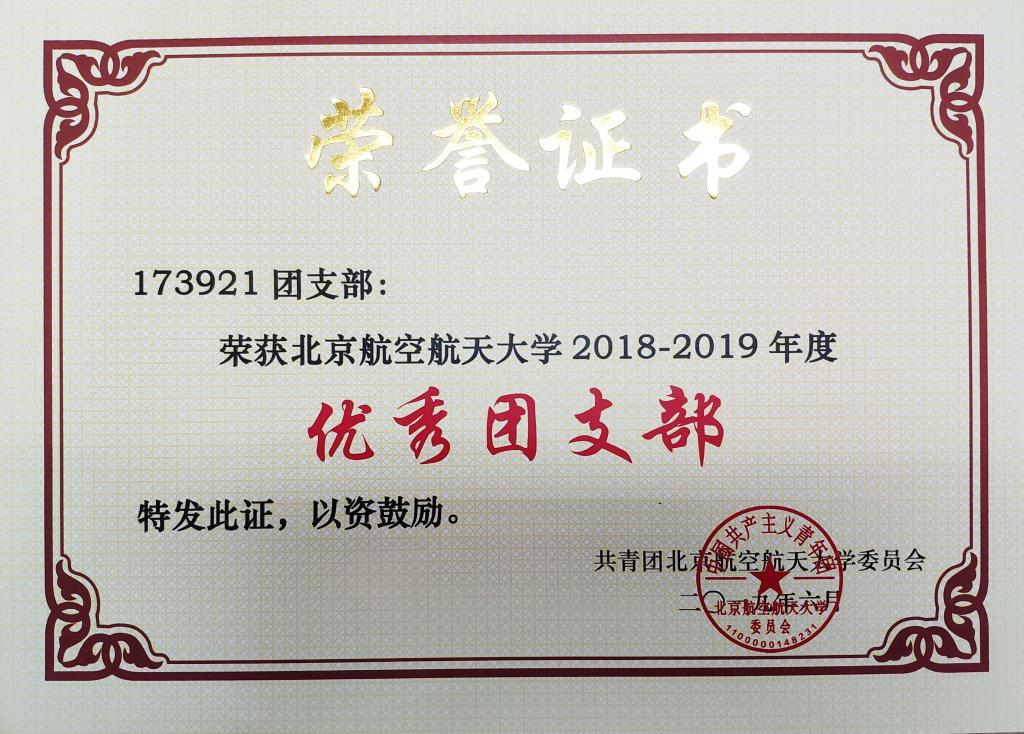为加强我校共青团的基层组织建设,推动团支部职能化建设,围绕立德树人根本任务,激励基层团支部学习贯彻习近平新时代中国特色社会主义思想,以“四进”为手段,以“四信”为目标,切实学习和践行社会主义核心价值观,弘扬北航“四爱精神”,深入开展“青春心向党·建功新时代”教育实践,创先争优,激励和引导广大团员大力弘扬爱国主义精神,推动各级团组织工作水平的提高。校团委在全校开展2018—2019学年度校 “优秀团支部”评选活动,滚球买球的app官网173921团支部获2018—2019学年度校“优秀团支部”荣誉称号,予以表彰。