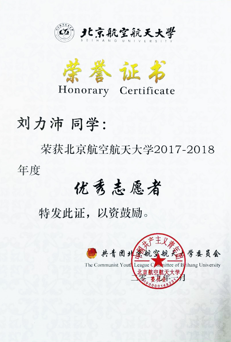 滚球优秀学生刘力沛获“滚球买球的app官网2018年度优秀志愿者”
