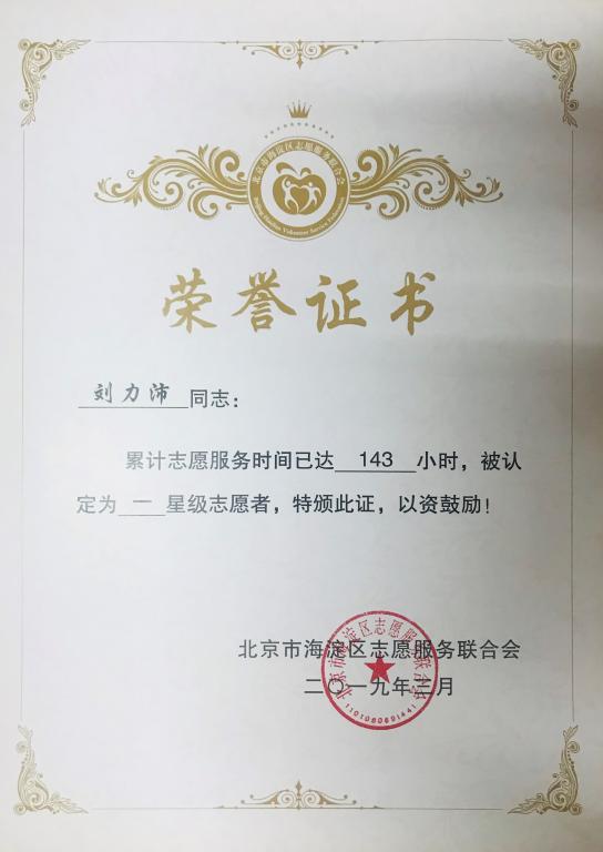按照 北京市海淀区志愿服务联合会《关于认定星级志愿者以及评选表彰2018年度海淀区明星志愿者、优秀志愿服务团队、优秀志愿服务项目的通知》的相关评比办法,经过单位推荐、材料核实、评委老师评审等程序,滚球优秀学生刘力沛获“2018年度海淀区一星级志愿者”荣誉称号,予以表彰。