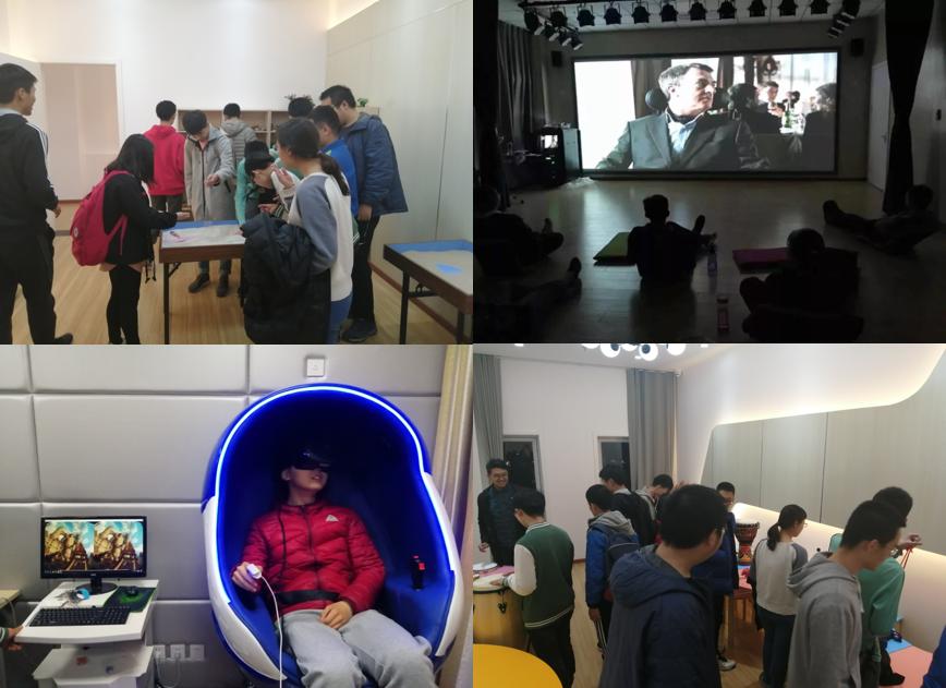 在心灵映像馆里,讲解员为大家介绍了这间教的主要功能,同学们可以坐在这里,看一场电影,做一场放空心灵的旅行。随后大家来到艺术心理辅导室,各种各样的拟声乐器吸引了大家的注意力,同学们即兴进行了一场欢快的交响音乐会。紧接着在一沙一世界教室,讲解员说心理老师可以根据同学在沙子里摆出来的一些组合和形状,得到一些关于同学心理状况的信息。最后的VR教室给大家带来了无限的欢乐,大家对这个VR体验都抱有非常大的兴趣,纷纷上前体验。
