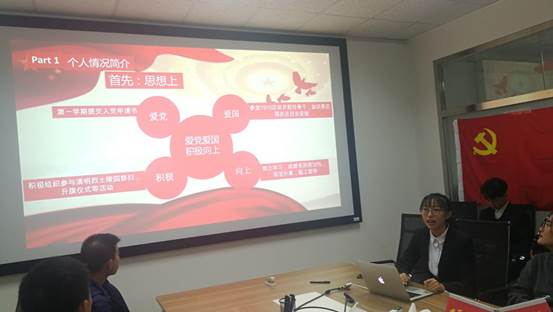 学生党支部书记战姝宇主持会议。她介绍了一名合格党员的基本素养以及身为党员的责任和义务,并要求答辩秉持客观、公正的原则全面考量。