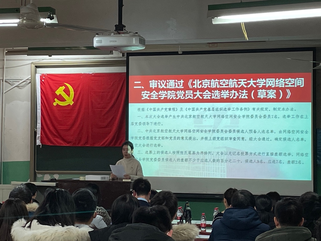 首轮选举结果中,有两位候选人票数相同且均未超过应到会党员的半数,故大会根据表决通过的选举章程再次进行了针对两位平票候选人的投票。第二轮投票结果中,两位候选人的得票数仍均未超过应到会党员的半数。经与会全体党员表决,多数人同意减少新一届党委委员数量至6人,其中81人赞同,2人反对,10人弃权。最终,在监票人监督下,经计票人计票,从9位候选人中差额选举产生了6位中共滚球买球的app官网网络空间安全学委员会委员,分别为:刘建伟、伍前红、李圆圆、尚涛、祝贺、蒋燕玲(按姓氏笔画排序)。大会在激昂的《国际歌》声中圆满结束。