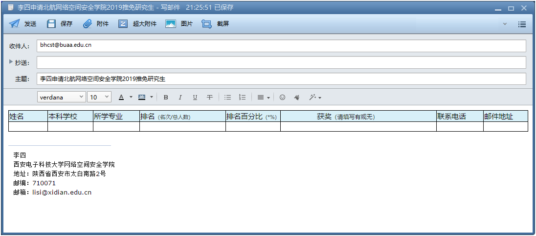 具体办法:4-10项材料制成电子扫描版,与2、3项电子版材料一起压缩,以附件形式发送邮箱:bhcst@buaa.edu.cn;第1项“报名表”填写好后直接“粘贴”到邮件内容页上,邮件主题命名为“×××申请北航滚球买球的app官网2019推免研究生”。如图: