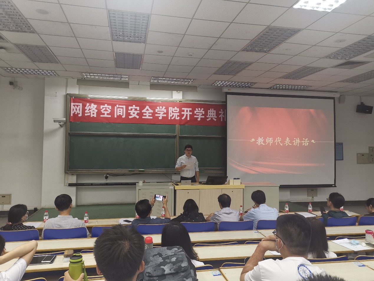 老生代表敦明同学,以自身优异的成绩和科研成果,给新同学分享了读研一年来的学习经验,让大家体会到了埋头苦读的不易,同时也看到了收获成果时的喜悦。新生代表朱浩同学,以北航网安学院新成员的身份,代表新生们表达了仰望星空、脚踏实地的决心。