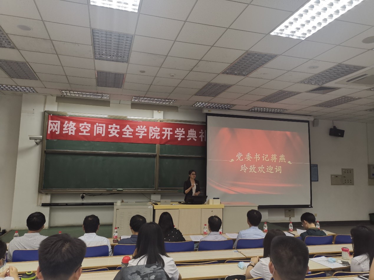 蒋燕玲书记代表网安学院全体师生对新同学表示热烈的欢迎和衷心的祝贺,蒋书记亲切的话语让同学们感受到家一般的温暖,蒋书记寄语新生,要勇敢肩负起时代赋予的重任,努力在实现中华民族伟大复兴的中国梦的生动实践中放飞青春梦想。